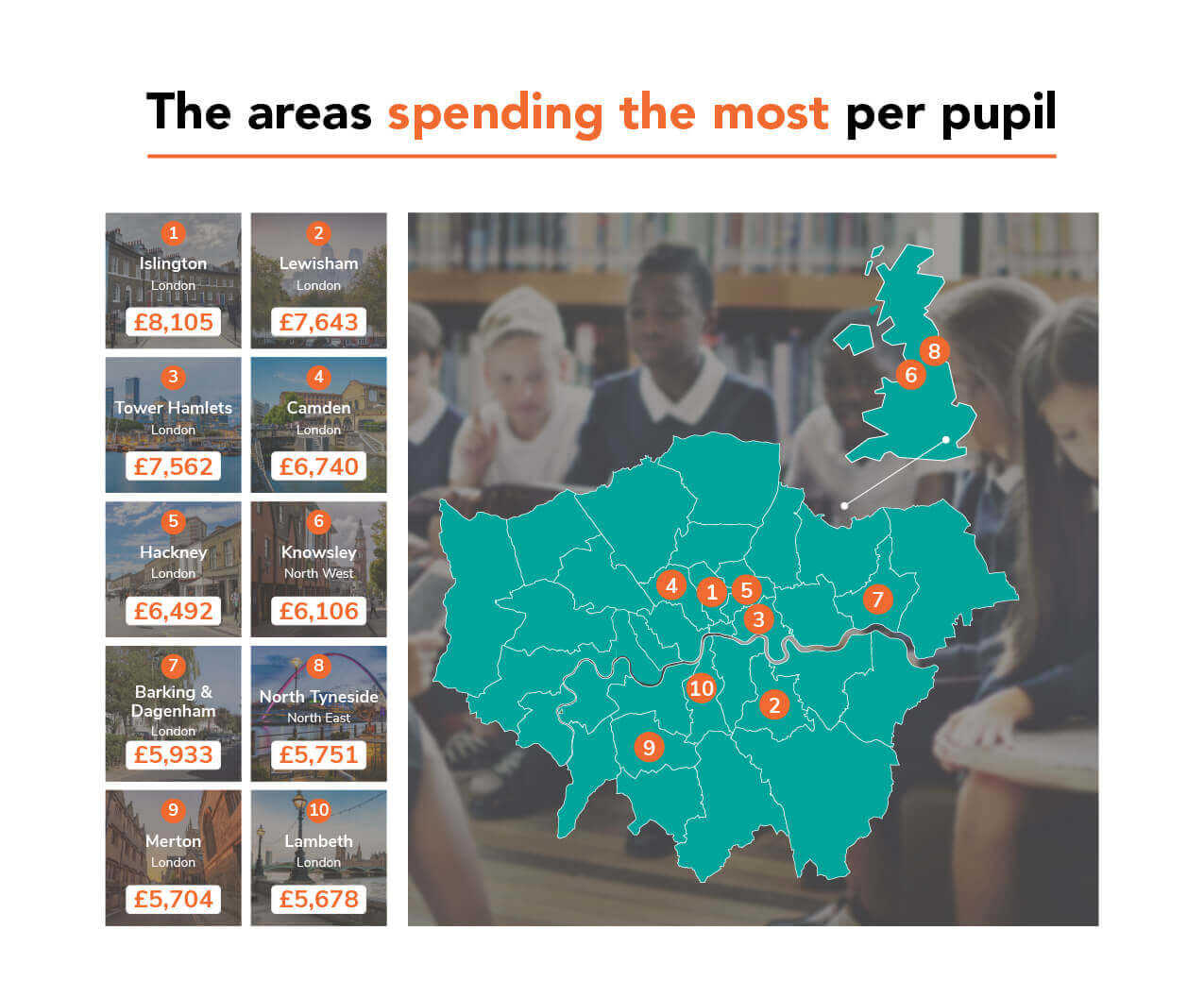 It’s clear that it’s pupils in London who enjoy the greatest funding in the country, with eight of the top ten highest-spending areas located in the capital, with Islington being the highest, at £8,105 per pupil.