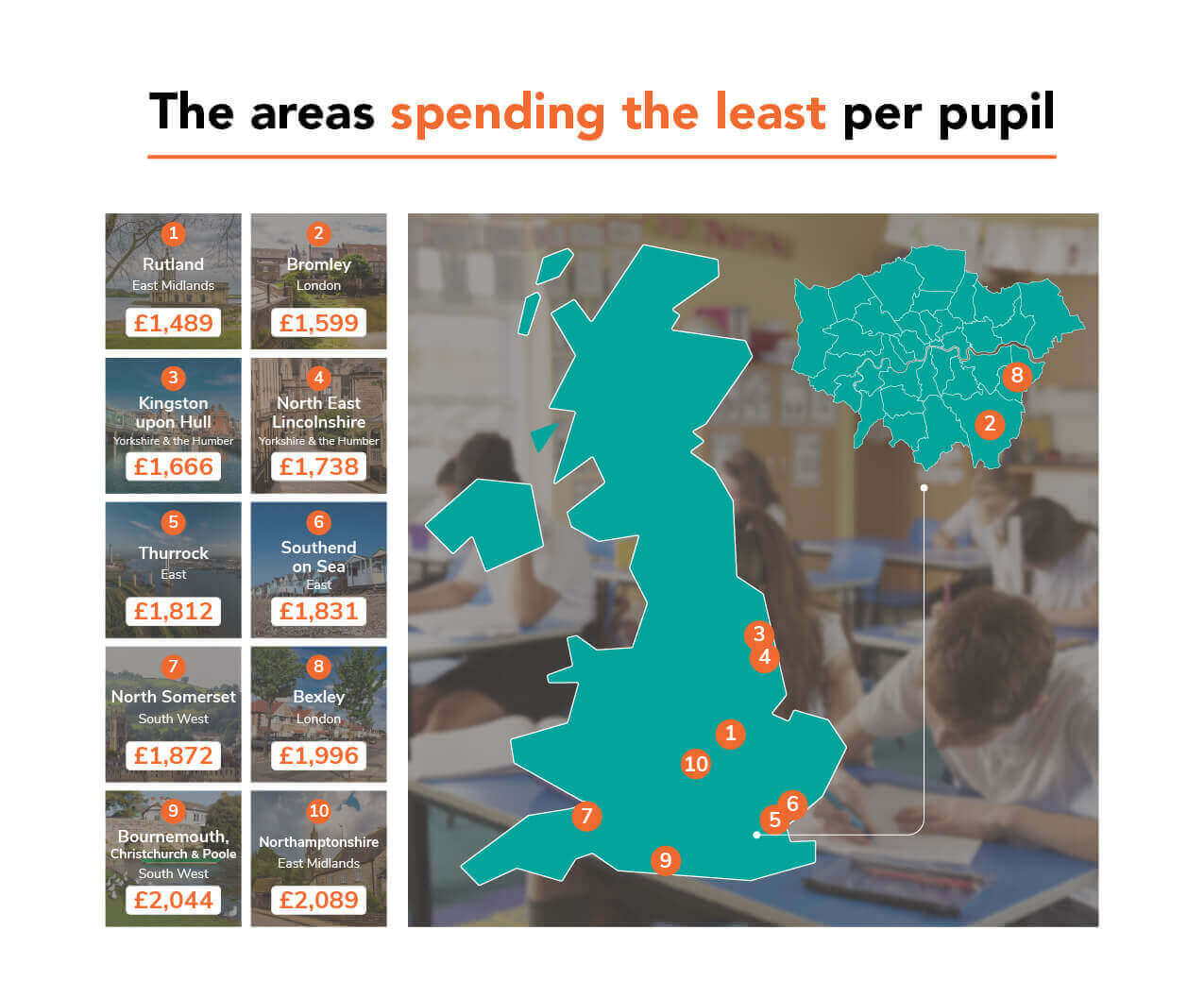 Interestingly, despite previously highlighting that spending per pupil is much higher in London than in other parts of the country, two London boroughs fell into the ten areas with the lowest spend per pupil too: Bromley (£1,599 per person) and Bexley (£1,599 per person).