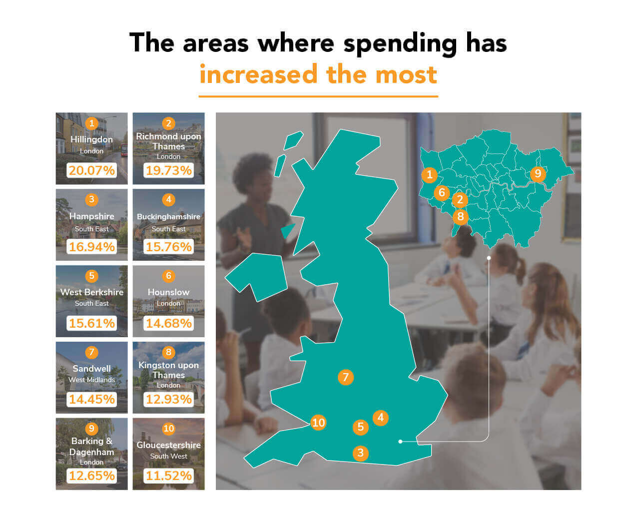 Five London boroughs fell in the top ten areas with the biggest spending increase, with Hillingdon increasing the most, from £162 million in 2014-15, to just under £195 million in 2019-29, an increase of 20%.