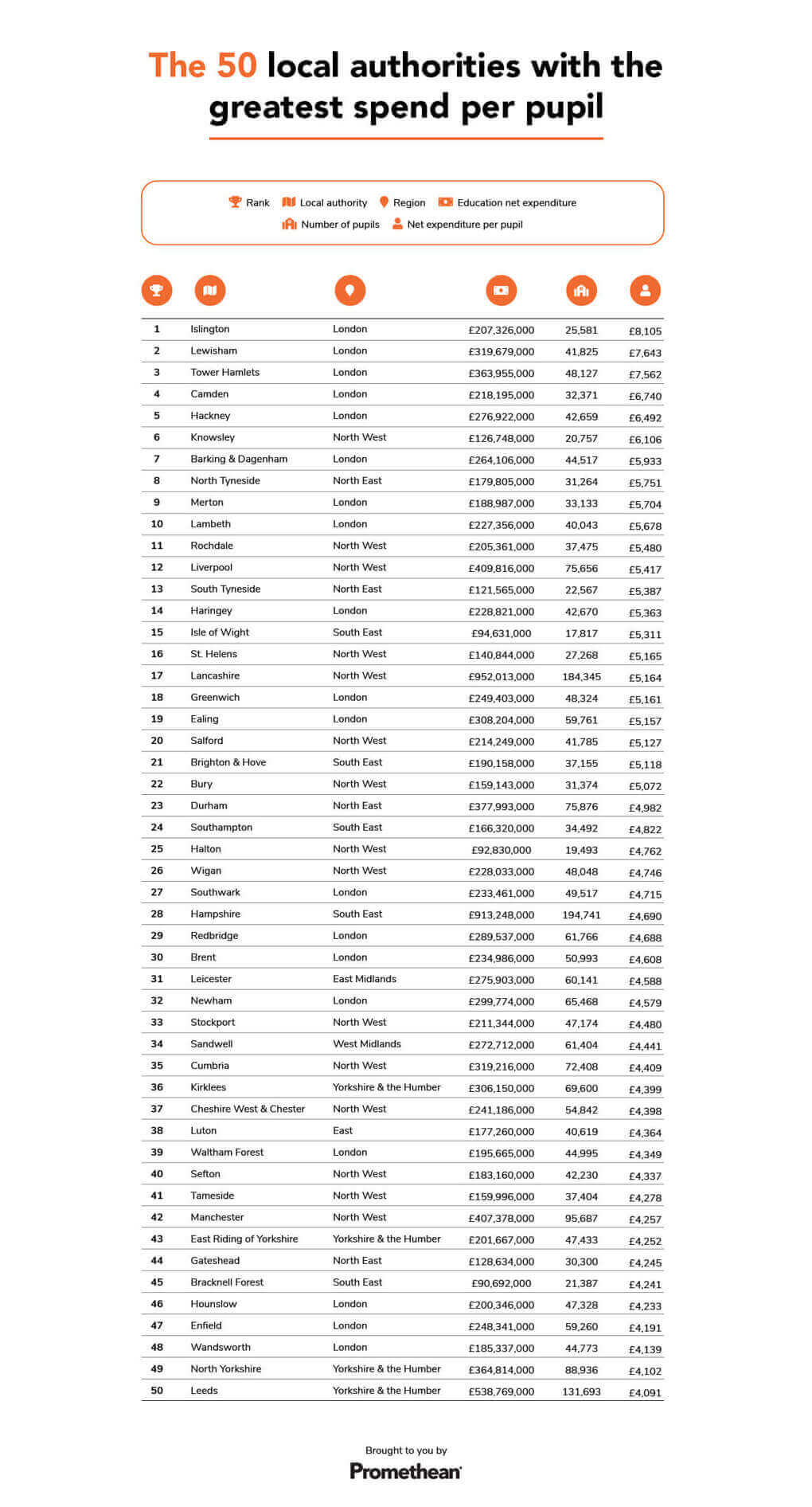 The only two areas from outside London in the top ten were Knowsley (£6,106 per pupil), on Merseyside, and North Tyneside (£5,751 per pupil), in the North East.