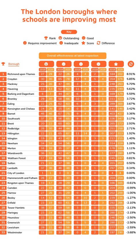 - When it comes to the London boroughs that are improving the most, Richmond upon Thames sees the biggest increase of 8.91%, both increasing the number of schools receiving the highest rating and raising the two schools that were previously ranked as inadequate to higher ranks.