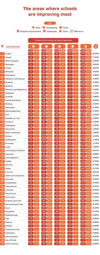When looking at the most improved areas, we assigned a score to each ranking, outstanding equalling 4, down to inadequate equalling 1. This allows for schools to be compared to one another, yet does not account for the possible variation between schools with the same Ofsted rating, for example in terms of performance or student experience.